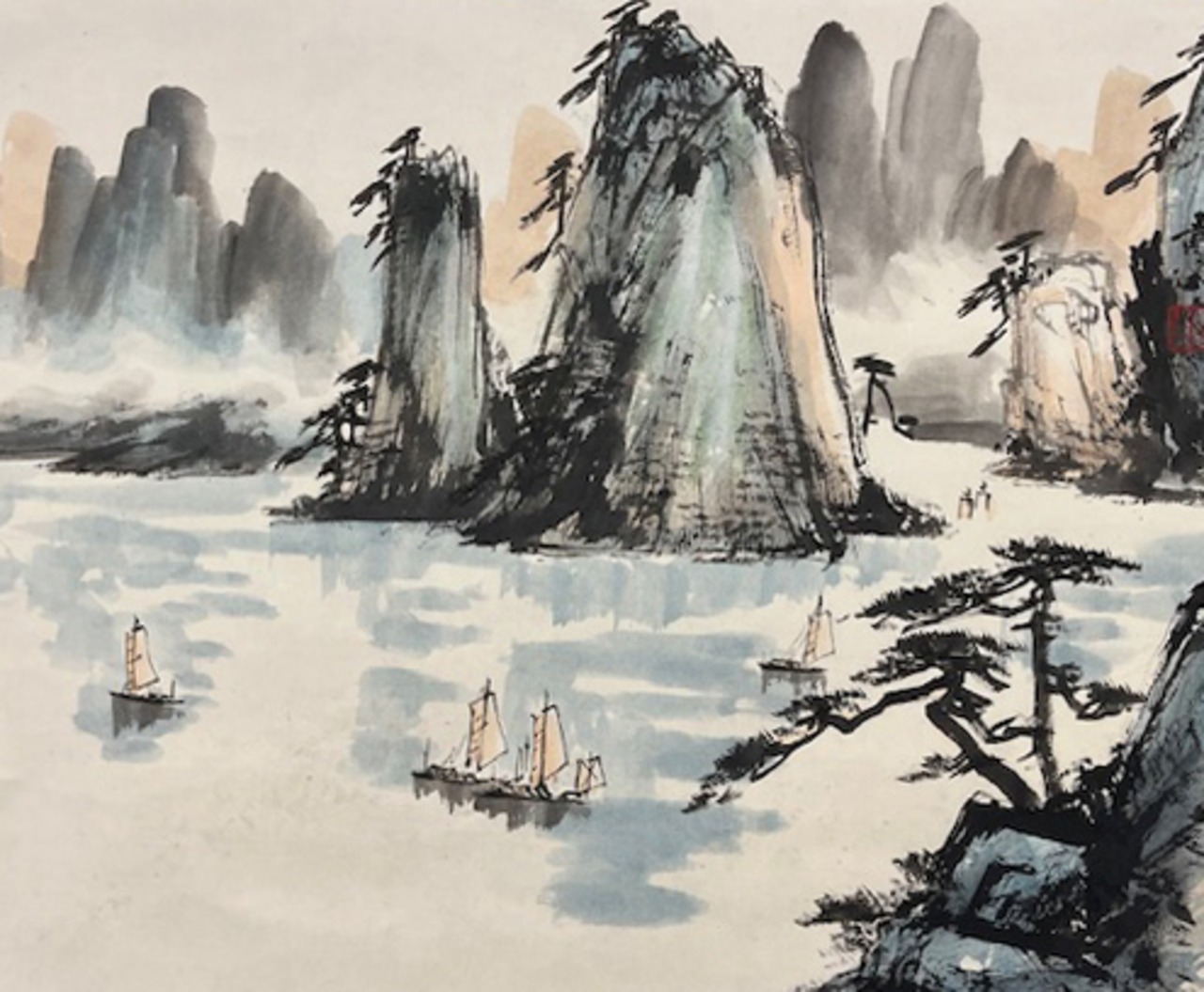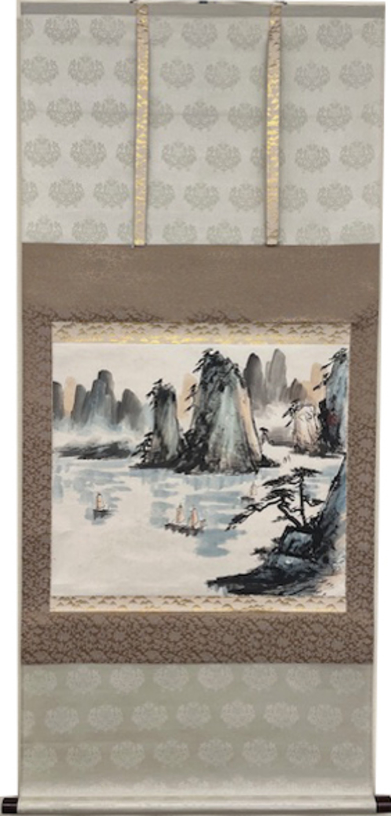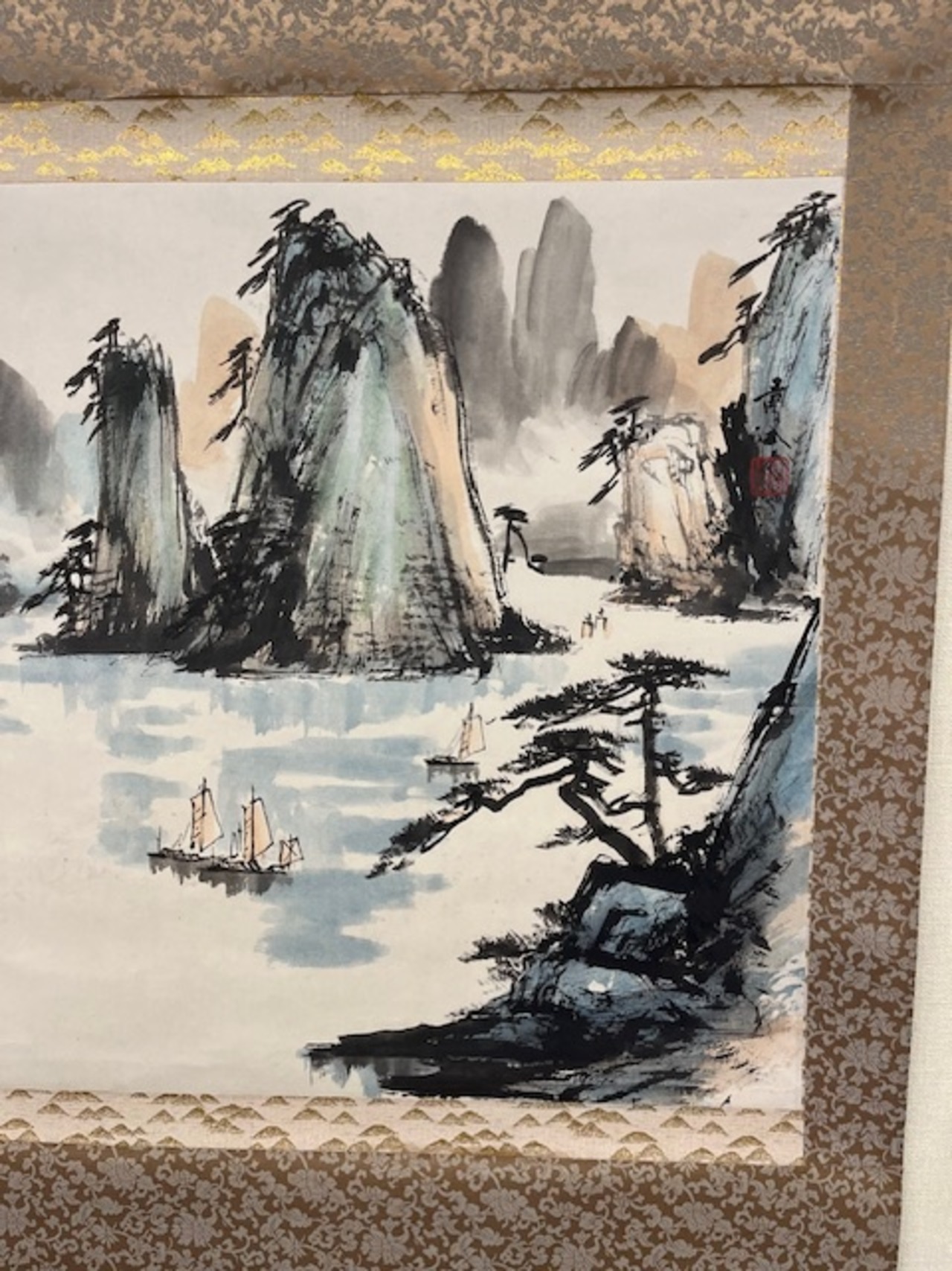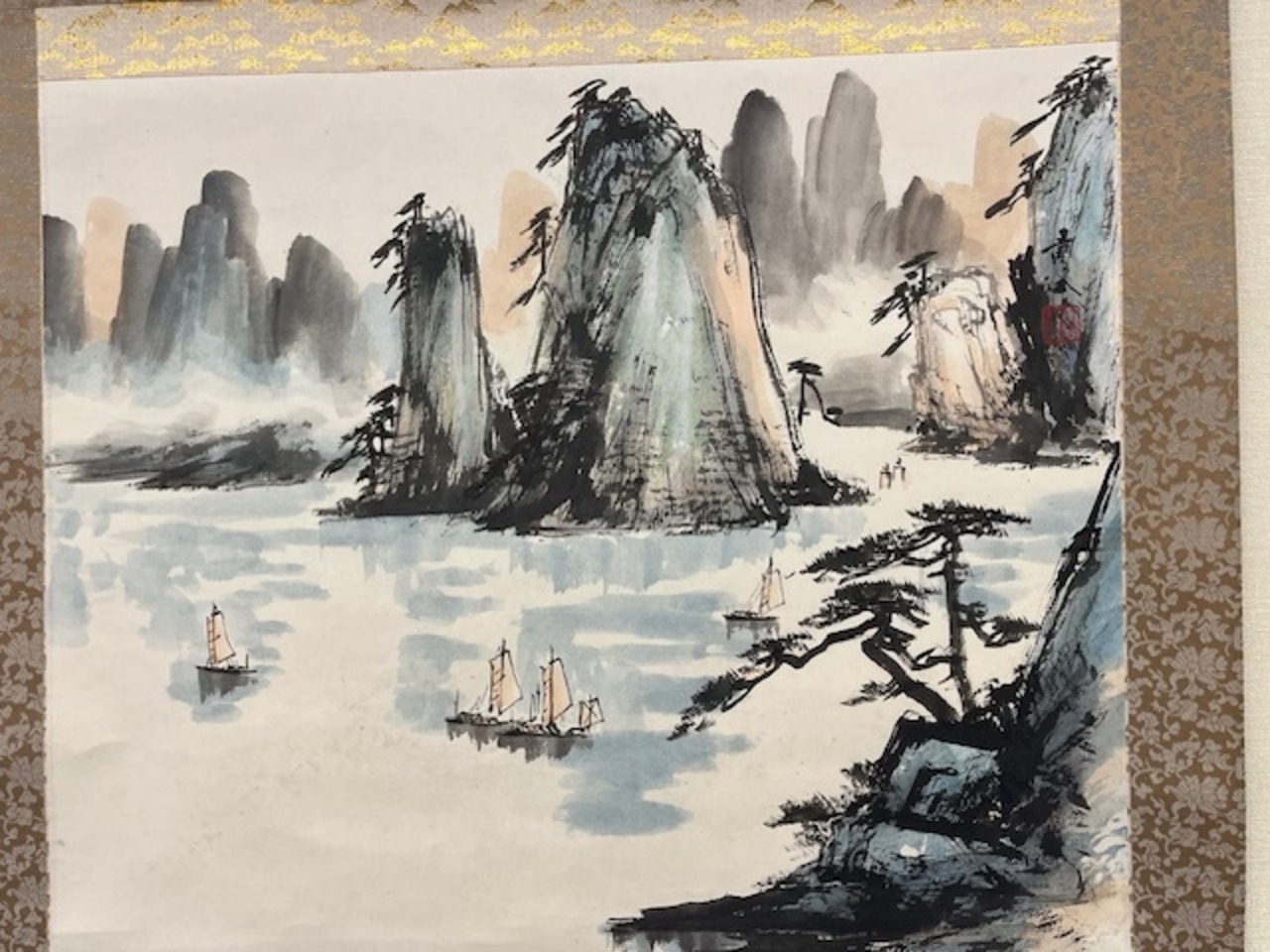 カタログ251ー8 手描き 肉筆特価 水墨山水(彩色) 尺八横 黄谷画