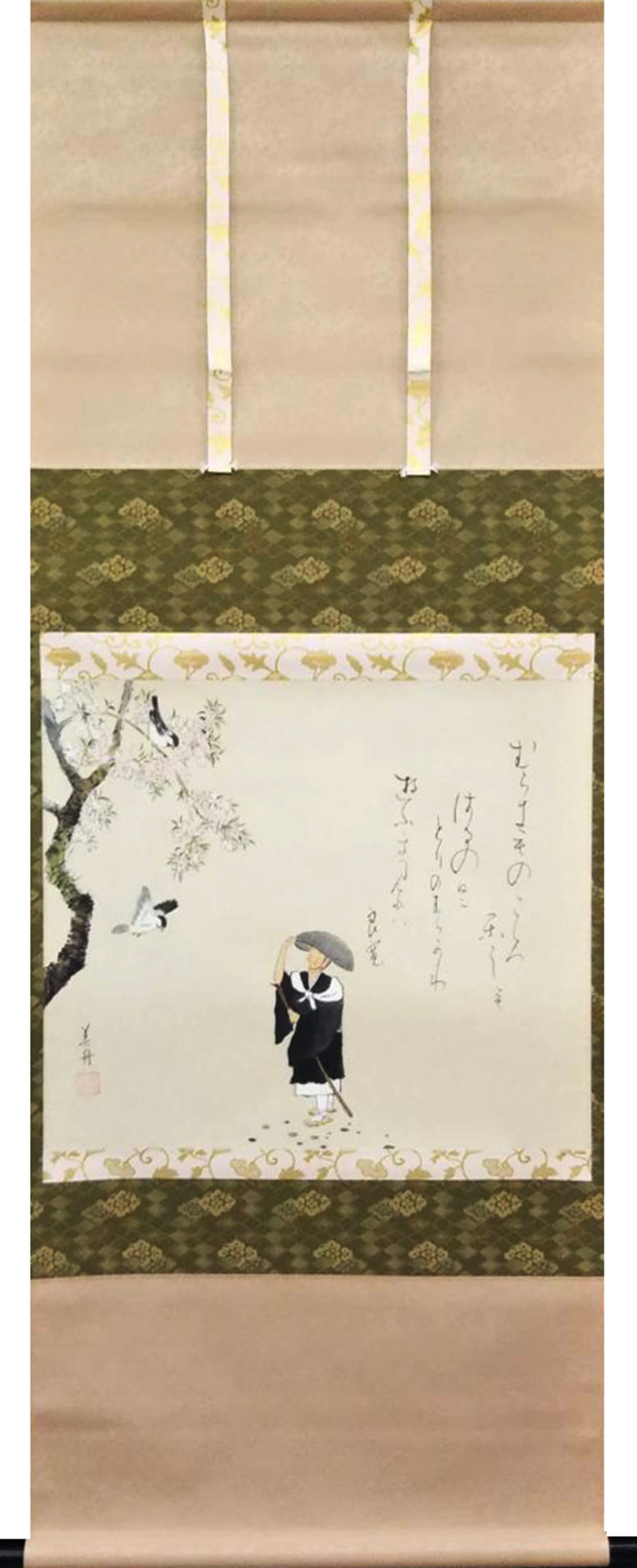良寛と桜のコンビネーションは、季節を問わず見る人々に心温まる光景を提供し、和の空間をより一層引き立てます。本作品は手描きの趣があり、永く愛用するのにぴったりの一幅です!