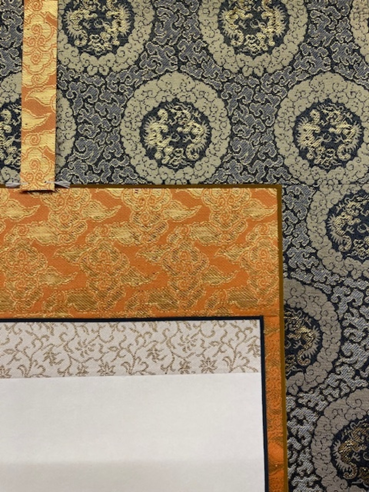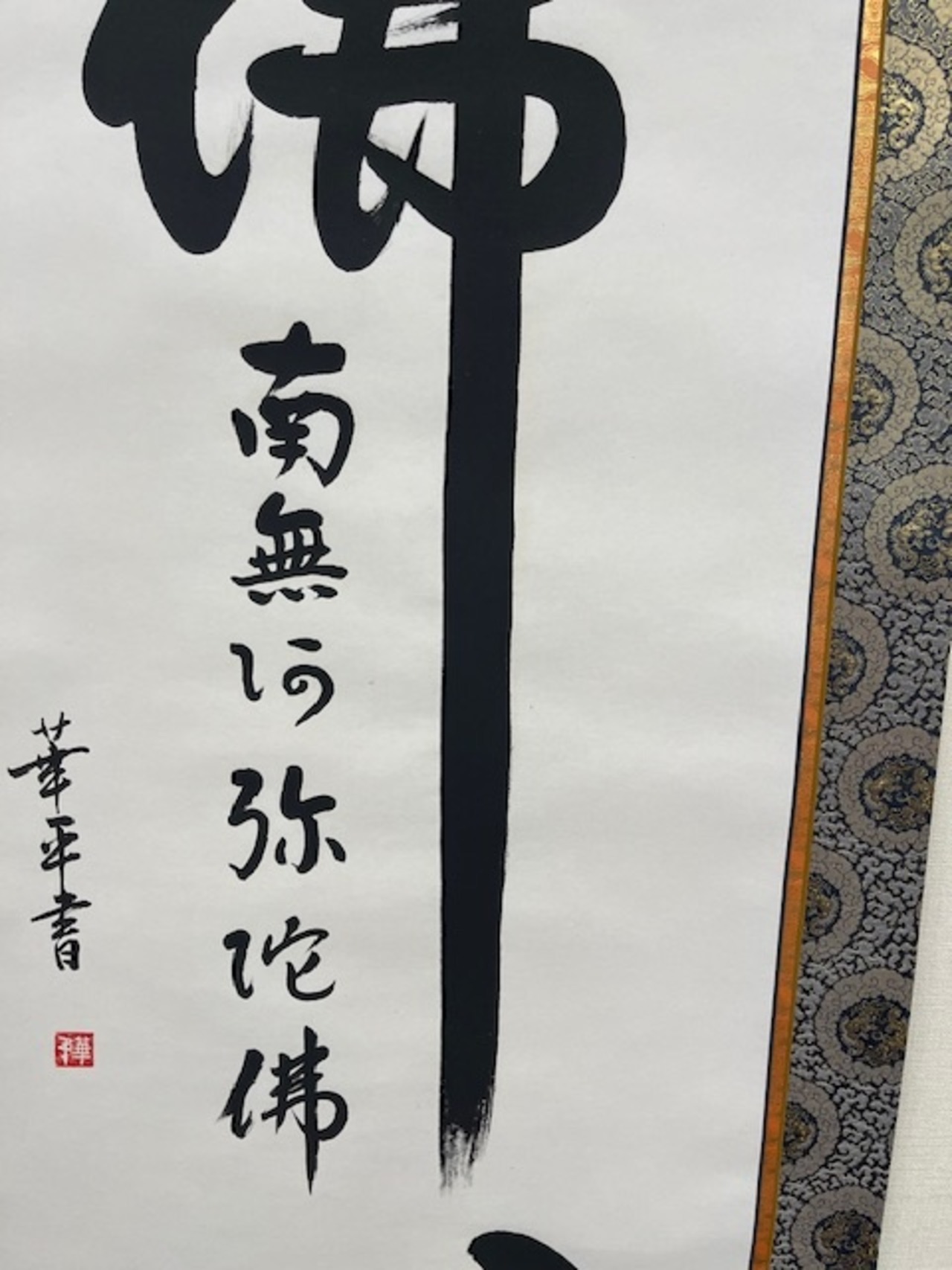 華平による六字名号の掛軸は、精神的な安らぎと深い意味を感じさせる特別な御掛軸です。この尺五立の作品は、洗練された優美な書体で六字名号を揮毫し、その神聖な響きが心に静かな感動を与えます。表装は匠の技が光り、細部にわたる配慮が施されています。空間に荘厳さと和の深い魅力をもたらします。稀少な直筆 特別揮毫作品です。