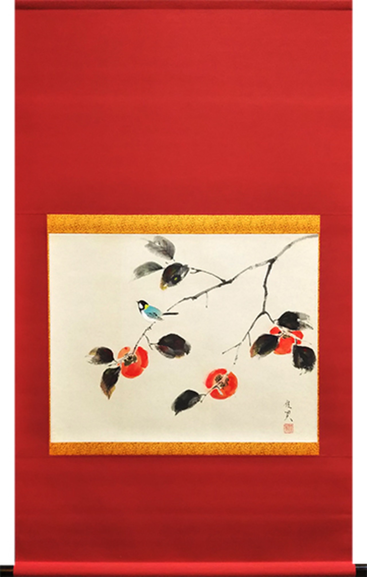 島田佳昊による真筆の「柿」掛軸は、熟した柿の実を描いた心温まる作品です。この尺八横のアートピースは、優雅な筆致で秋の豊かさを表現し、その仕草が見る人々にほっこりとした気持ちを届けます。豪華な表装が施され、空間に柔らかい温もりと豊かな情緒を加えます。