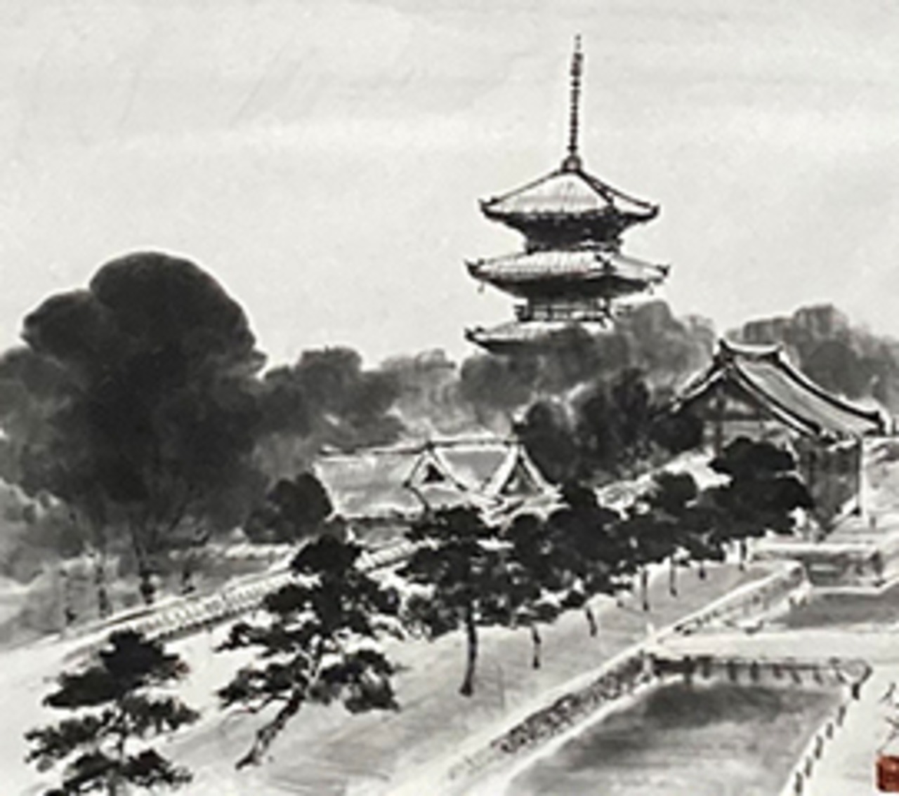 カタログ251ー32 水墨塔風景(東寺) 尺八横 ギャラリー近代所属 島田佳昊 真筆 本仕立
